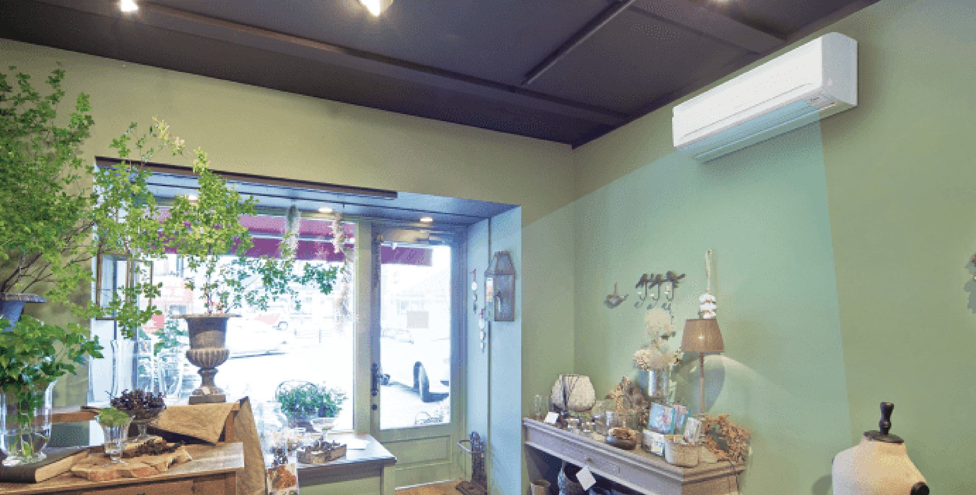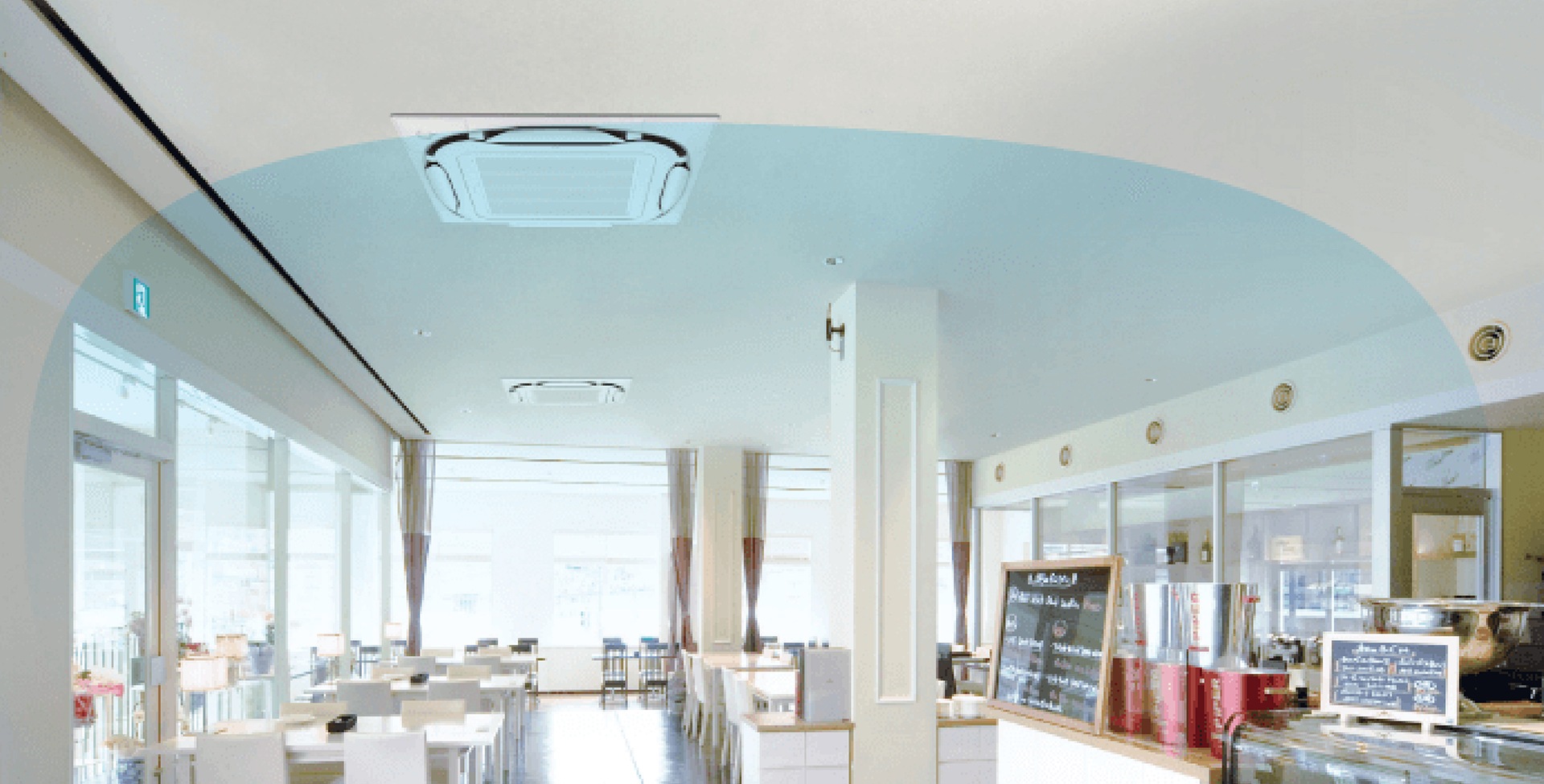 本体を天井に埋め込むので目立ちません。吹き出し口の位置や数で気流を分散させられるため、店舗内の形やインテリアに合わせた最適な空調環境をつくれます。