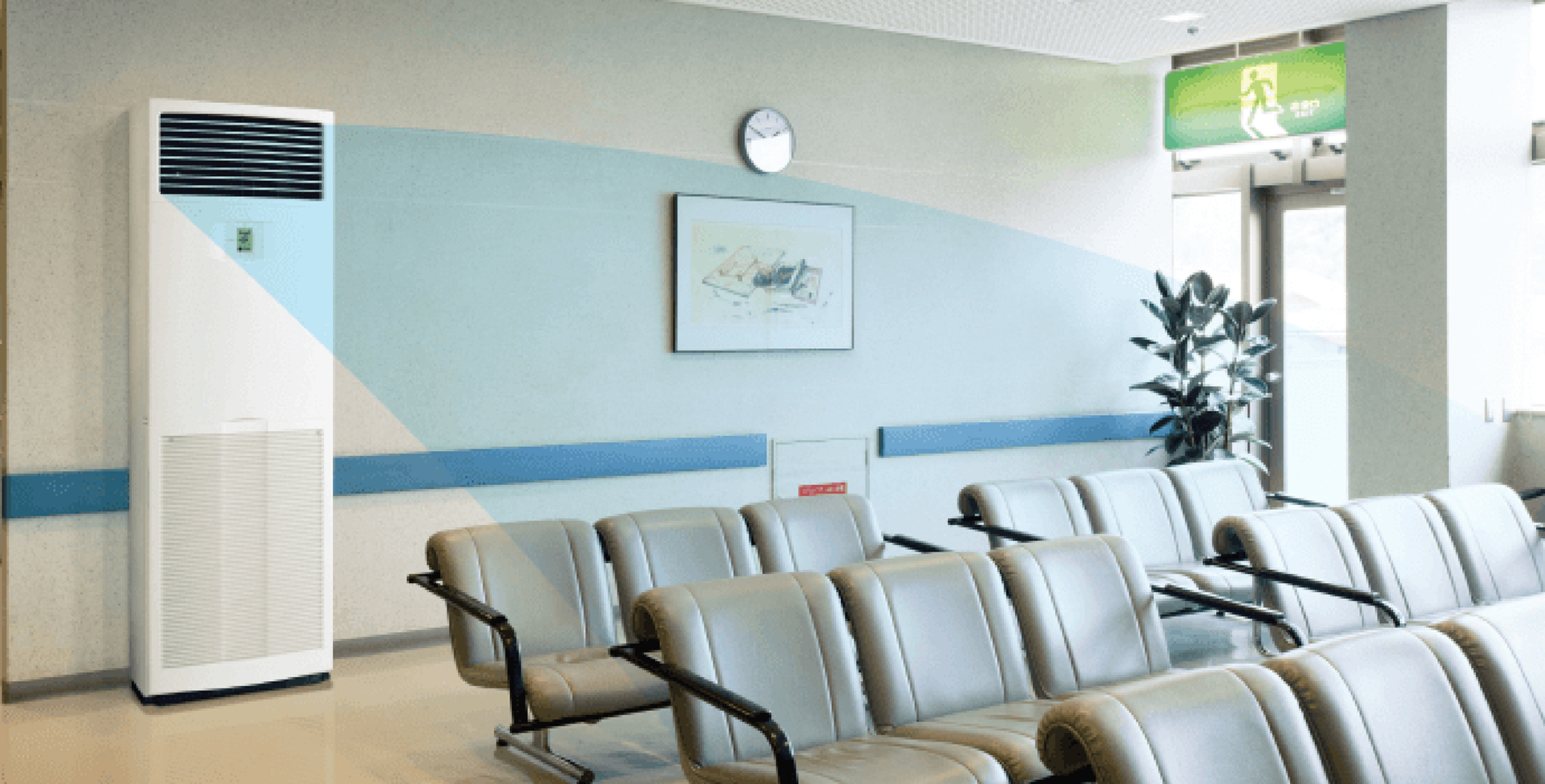 設置が手軽で、天井が低く天井埋込形や天井吊形が設置しにくい場所にも置きやすく手入れもしやすい。また床に置くので暖房効果が感じやすくなります。