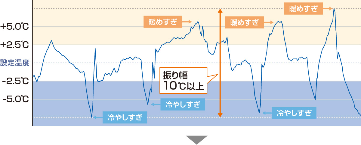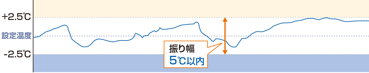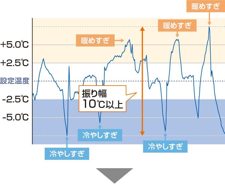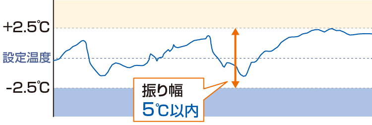 室温の目標温度範囲は、設定温度に対して±2.5℃以内。センサーで取り込んだ室内温度や外気温度を簡単にグラフ化し見える化できるので、室温が目標の温度範囲内に収まっているかどうかを一目で確認することができます。