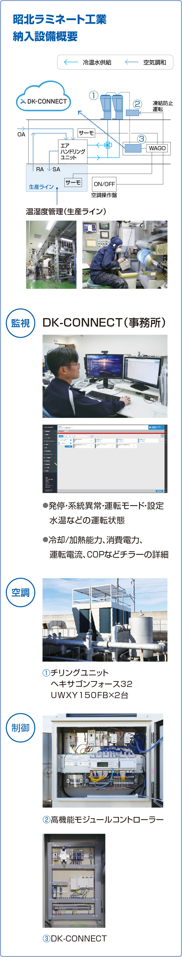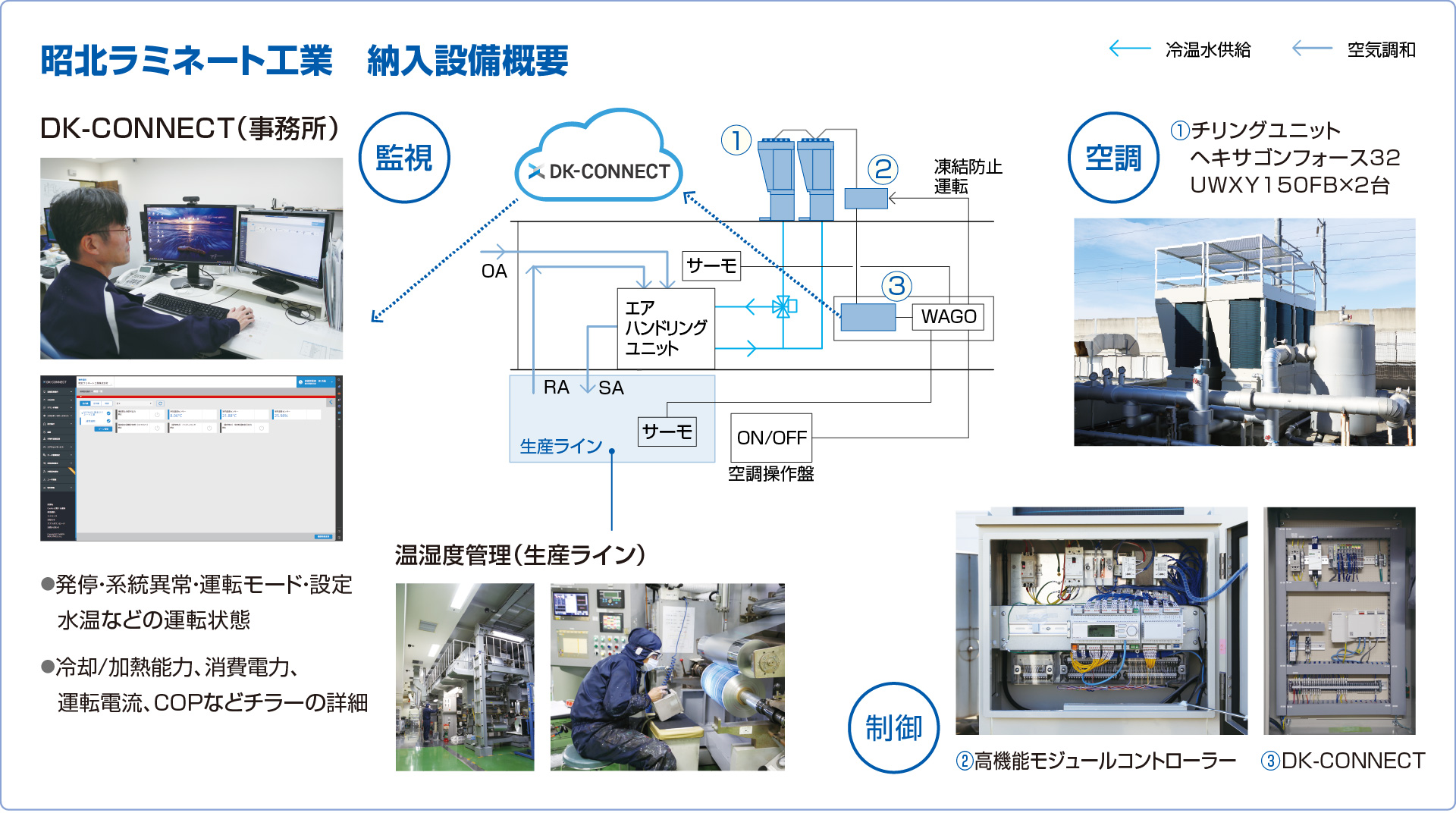 ●生産ラインに温度センサーを取り付け、DK-CONNECTに取り込むことで、室温に応じたチラーの送水温度制御が可能となりました。温度設定や制御内容の変更時は、遠隔から変更でき使いやすいです。