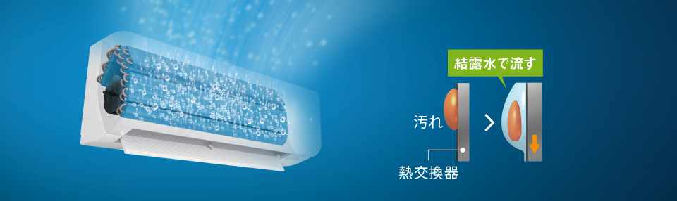 内部クリーンの対象部位は、熱交換器および気流通路です。熱交換器や吹き出し口の内部に、ストリーマを照射。エアコン内部のカビ・ニオイの原因菌を抑制します。