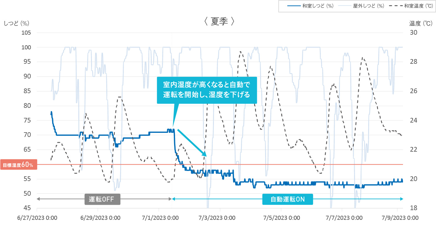 <運転条件> カライエ / 自動運転 【測定場所】和室面積10畳 【測定期間】2023年6月27日~7月9日(13日間) 【データ取得】10分毎に温湿度計で計測