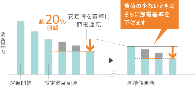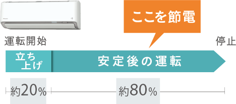 エアコンの運転時間の約80%は、室温が安定してからの温湿度を維持するための運転が占めています。新商品は、この長時間の安定後の運転について節電運転を行います。