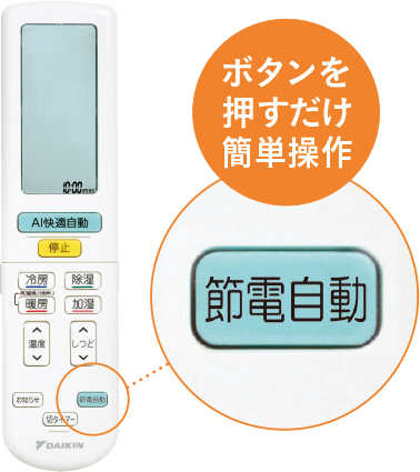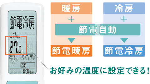 暖房・冷房運転中にリモコンの節電自動ボタンを押すと、温度設定ができる節電運転になり ます。