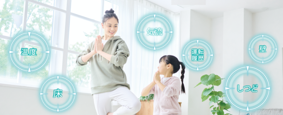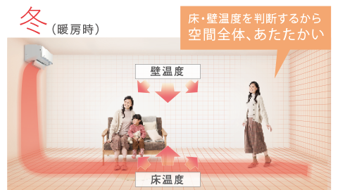 床や壁の温度(輻射熱)をセンシングした検知内容と、お客様が好みに合わせて変更された設定を記憶して「好みの運転」として学習。最適な運転・制御パターンをAIが判断し、より快適な自動運転を行います。