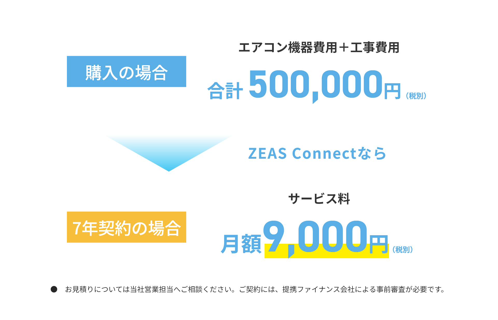 新しくエアコンを購入すると固定資産税がかかりますが、ZEAS Connectなら月額サービス料に機器費用が含まれているので経費処理できることが助かりますね。